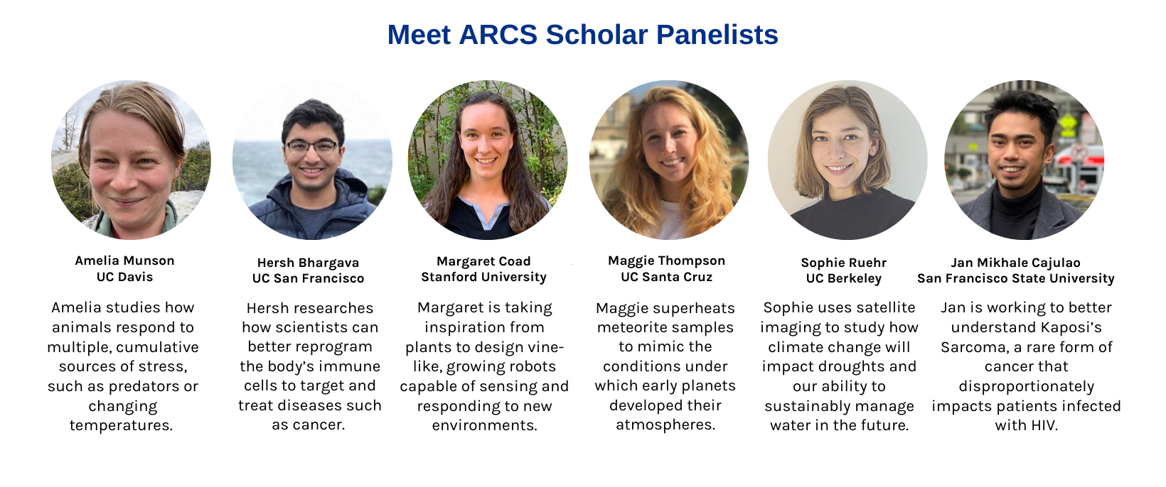 On April 26, the Northern California Chapter of ARCS Foundation (ARCS NCC) sponsored the 2021 ARCS Scholar Symposium as a virtual, free event. The virtual format more than doubled the number of people who were introduced to ARCS NCC Scholars – “the Minds of the Future.” These brilliant young scientists inspire us and give us hope for a better world for all. The Poster Halls displayed research by 74 current scholars; the program featured presentations by Nobel Laureate Dr. Jennifer Doudna and six current scholars with live Q&A; the Roundtables focused on what this past year was like as a graduate student and what comes next. Symposium recordings are available on our YouTube channel, https://www.youtube.com/channel/UCrMA4oJIWDyTjYpcTd6csng.