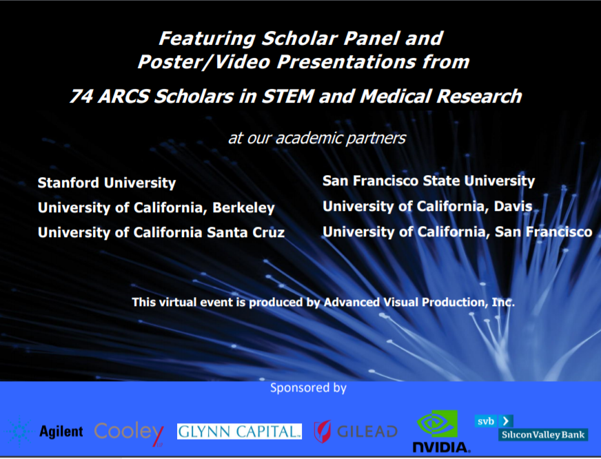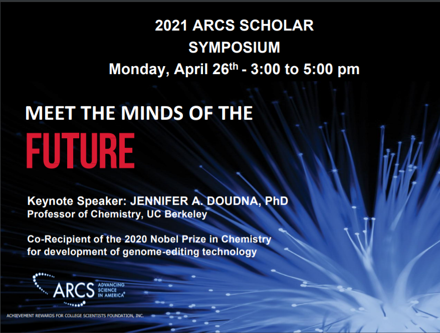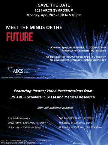 On April 26, the Northern California Chapter of ARCS Foundation (ARCS NCC) sponsored the 2021 ARCS Scholar Symposium as a virtual, free event. The virtual format more than doubled the number of people who were introduced to ARCS NCC Scholars – “the Minds of the Future.” These brilliant young scientists inspire us and give us hope for a better world for all. More good news: the Symposium website remains live until May 15 (https://2021-arcs-symposium.com). The Poster Halls display research by 74 current scholars; the program features presentations by Nobel Laureate Dr. Jennifer Doudna and six current scholars with live Q&A; the Roundtables focus on what this past year was like as a graduate student and what comes next. After May 15, Symposium recordings will be available on our YouTube channel, https://www.youtube.com/channel/UCrMA4oJIWDyTjYpcTd6csng.