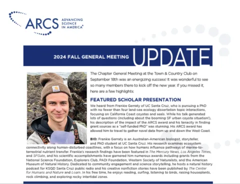 The ARCS Northern California Chapter October 2024 newsletter is now available! This month's publication features a scholar presentation from Frankie Gerraty (an Australian-American biologist, storyteller, and PhD student at UC Santa Cruz), committee reports, and important upcoming dates.